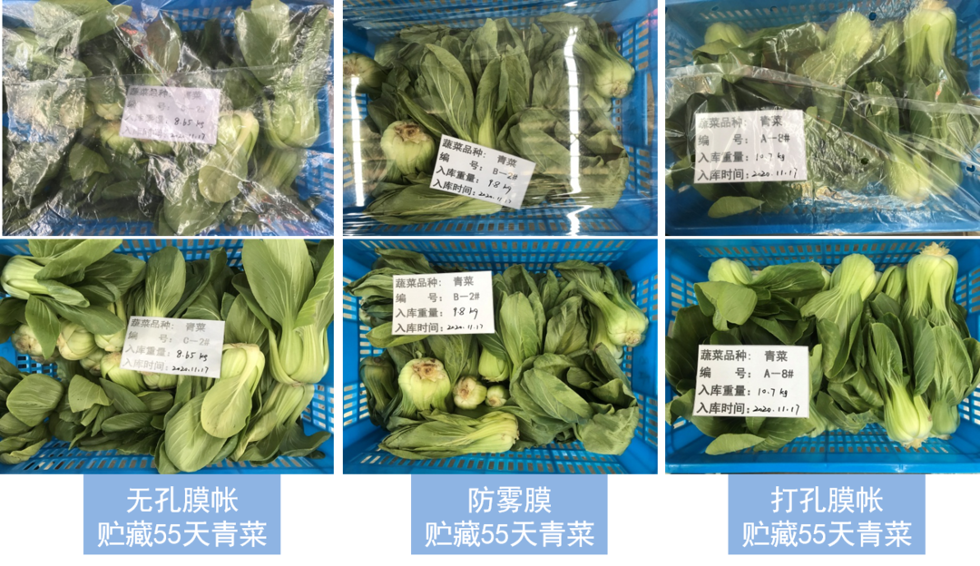 20201117~202119日,我司順利完成了為期55天的廠內(nèi)蔬果保鮮試驗(yàn)。通過以往試驗(yàn)發(fā)現(xiàn),在貯藏過程中,保鮮袋內(nèi)表面水氣結(jié)露嚴(yán)重,水滴落到蔬菜表面引起變質(zhì),若不套袋,蔬菜的干耗又會非常嚴(yán)重,而加濕器附近、冷風(fēng)機(jī)附近也會因?yàn)槔淠牡温涠写罅糠e水。此次試驗(yàn)針對此問題,對比探討防霧膜、打孔膜帳及無孔膜帳三種包裝方式的保鮮效果,以期改善包裝內(nèi)結(jié)露的問題。同時(shí)也為氣調(diào)冷藏集裝箱增加臭氧殺菌模塊,提升設(shè)備功能,減輕微生物腐敗給果蔬帶來的不良影響。通過指標(biāo)測定顯示,打孔膜帳包裝使綠葉蔬菜(青菜、油麥菜為例)失重率均小于10%,能夠維持較高的可滴定酸含量,延緩可溶性固形物下降,貯藏末期時(shí)兩種菜可溶性固形物含量下降均不超過2%,在降低Vc、葉綠素的消耗及減輕葉片膜脂過氧化程度方面也有一定促進(jìn)作用;此外,經(jīng)過改進(jìn),此次試驗(yàn)也將往常45天保鮮期延長至55天,具有重要突破意義。